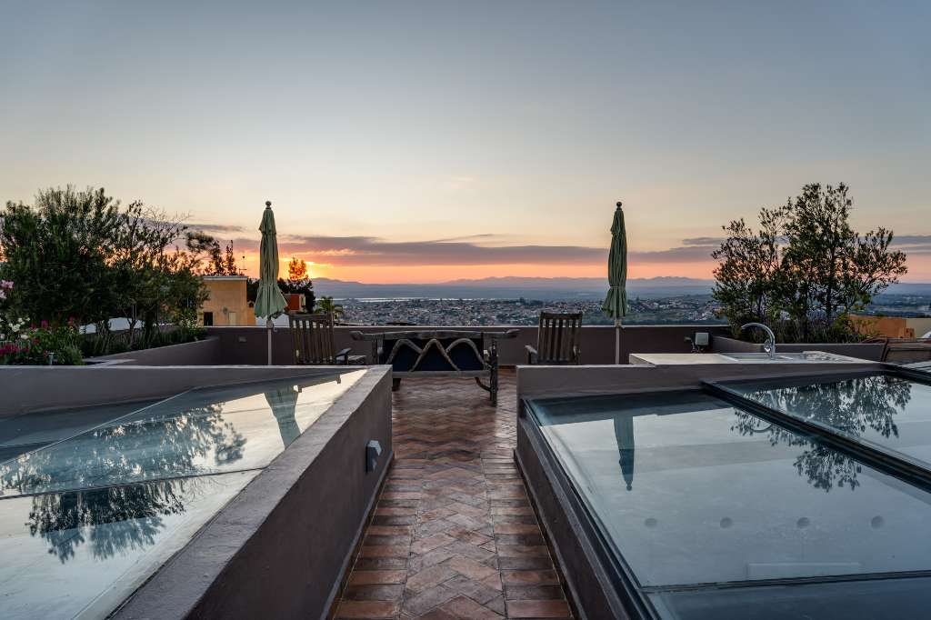 The rooftop terrace crowns the home with stunning 360-degree views of San Miguel de Allende—an ideal setting for sunset gatherings or quiet morning coffee.