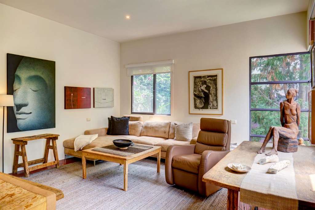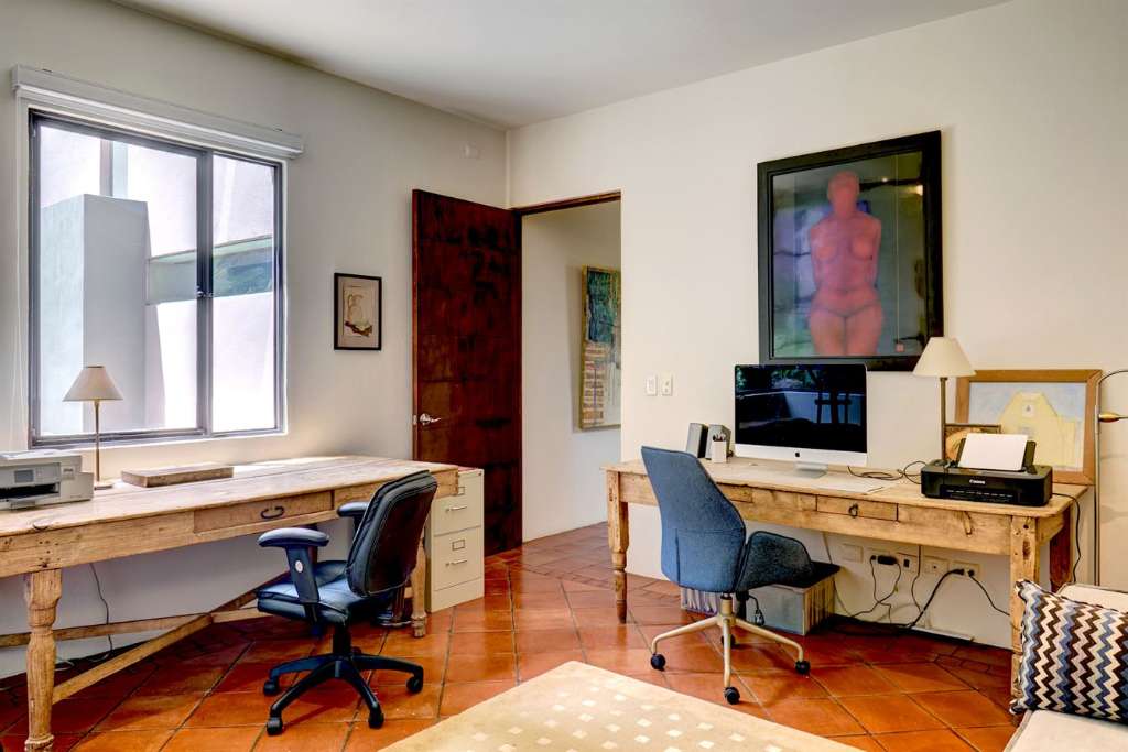 One of the standout features is the option for complete one-level living. A spacious ground-floor bedroom with an en suite bath opens through French doors to a private patio and garden seating area—perfect for quiet mornings or evening relaxation. Also on the main level, you’ll find a generous studio which could easily be converted into an additional bedroom, giving this San Miguel de Allende home the potential to become a three-bedroom residence, depending on your needs.