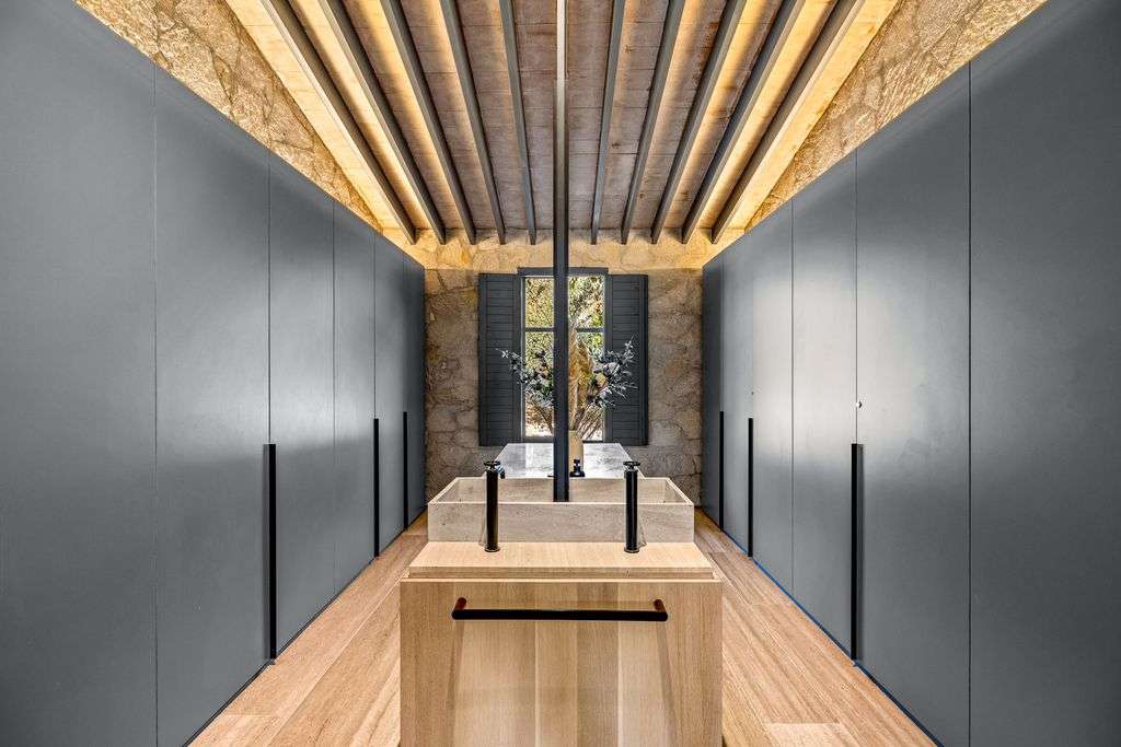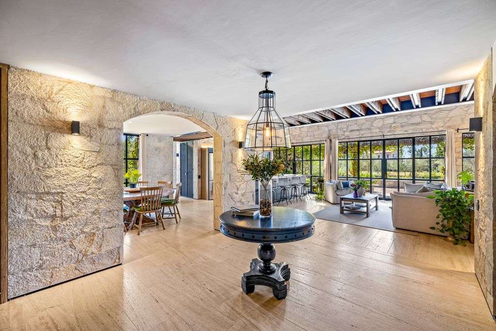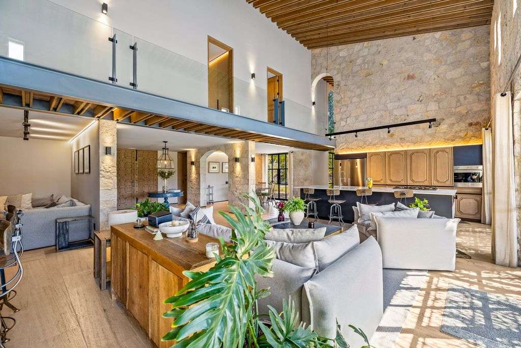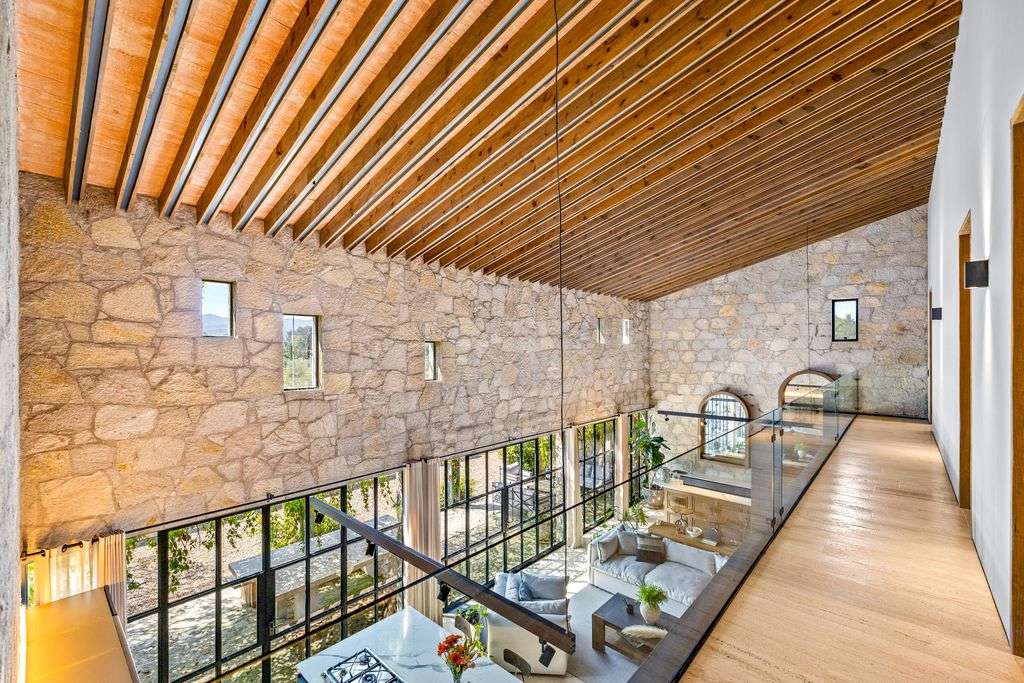 Beyond its hand-carved wooden doors, the home unfolds into luminous, open spaces that balance rustic textures with contemporary sophistication. Soaring ceilings, exposed beams, and artisanal woodwork create an atmosphere of understated grandeur, while expansive glass doors blur the boundaries between indoor comfort and the natural beauty outdoors.