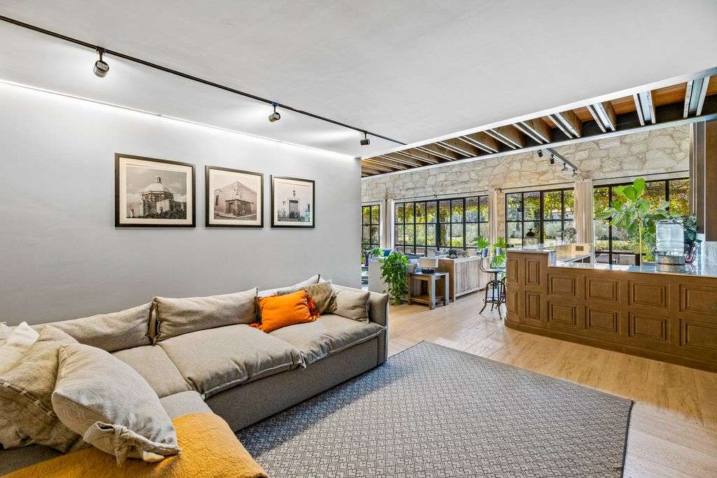 Outdoors, Casa Wisteria celebrates the art of al fresco living. Terraces shaded by vine-covered pergolas lead to a serene solar-heated pool, fire pit, and dining patio, the ideal setting for golden sunsets and starlit evenings. Beyond, the fragrant rows of lavender and grapevines invite long, unhurried afternoons. Each of the four en suite bedrooms offers privacy and quiet elegance. The primary suite on the ground floor opens directly onto the gardens, while the upper-level suite, featuring charming built-in bunk beds, adds a playful touch of design whimsy.